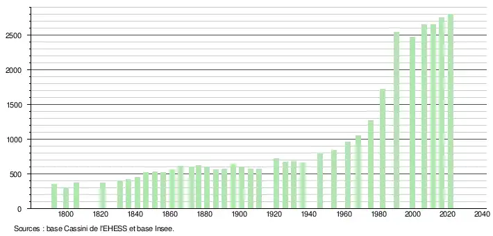 L'évolution du nombre d'habitants est connue à travers les recensements de la population effectués dans la commune depuis 1793. Pour les communes de moins de 10 000 habitants, une enquête de recensement portant sur toute la population est réalisée tous les cinq ans, les populations légales des années intermédiaires étant quant à elles estimées par interpolation ou extrapolation[32]. Pour la commune, le premier recensement exhaustif entrant dans le cadre du nouveau dispositif a été réalisé en 2006[33].