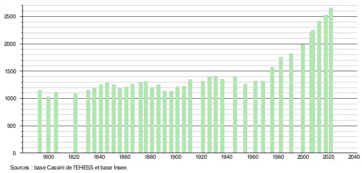 - Population municipale légale en vigueur au 1er janvier 2024, millésimée 2021, définie dans les limites territoriales en vigueur au 1er janvier 2023, date de référence statistique : 1er janvier 2021.