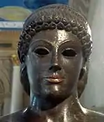 En bronze incrusté de cuivre et d'argent, elle mesure 1,15 m. de hauteur. Elle représente un jeune homme marchant dans l'attitude des kouroï grecs archaïques du Ve siècle av. J.-C., les deux mains avancées devant le corps devaient tenir des offrandes comme le suggère l'Apollon Philésios du Didyméion de Milet du sculpteur Canachos de Sicyone avec lequel il présente de nombreuses analogies.