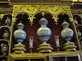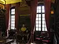 - L’apothicairerie, avec des frises présentant des peintures imitant le marbre, des boiseries rehaussées d’or, des étagères, rayonnages, placards, tiroirs et vitrines décorées de pilastres sculptés, et une belle collection de faïences à décor bleu et fleurs jaunes des ateliers de Lyon, Nevers, de la fin du XVIIe siècle.
