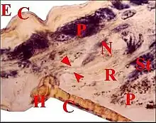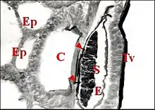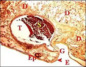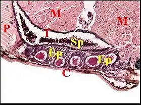 Juste avant d’aboutir à sa fusule, le canal traverse généralement un épiderme modifié (Fig.21,22). que Marples (1967) décrivit pour la première fois chez Hickmania dans une étude histologique rudimentaire. Cet épithélium, plus ou moins concave, déprimé en «cupule» ou «puits» (« pit ») (Fig.22), est formé par des cellules prismatiques hautes, à noyaux basaux, à cytoplasmes clairs, d’aspect «fibrillaire», pouvant renfermer des grains de pigment mélanique et est surmonté par un revêtement cuticulaire strié.