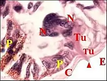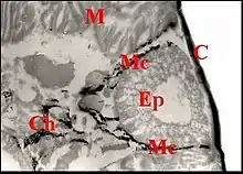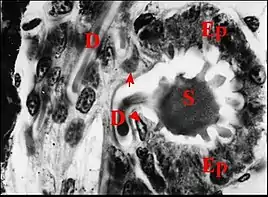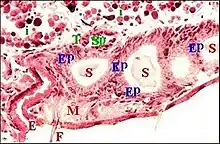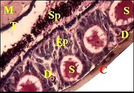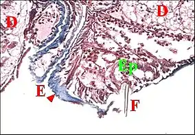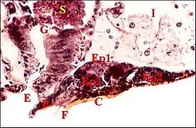 Le corps est formé par un épithélium simple (Fig.4 à 9) reposant sur une basale et non surmonté d’un revêtement cuticulaire. Ses cellules glandulaires ou adénocytes, prismatiques ou pyramidales, renferment des "boules" ou sphérules logées dans des "vacuoles" plus ou moins apparentes, déformant souvent le noyau et captant en général les colorants acides tels que le bleu d’aniline et l'éosine. Teintés également en violacé par l’hématoxyline de Mallory (Fig.7), ces grains de sécrétion réduisent le réactif de Schiff dans la méthode à l’APS (Fig.6,8). Ils passent ensuite dans la lumière et s’y accumulent sous forme d’une masse de sécrétion plus ou moins homogène et à contours festonnés (Fig. 5 à 9).
