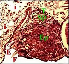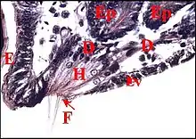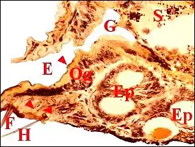 E, fente épigastrique - Ep, glandes épigastriques prégonoporales - F, fusules - G : gonopore -