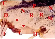 Flèche simple : terminaison de l'organe gonoporal (C.H.).