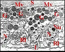 Les grains de sécrétion paraissent y naître près du pôle basal dans le réticulum endoplasmique (Fig.16). Ils sont régulièrement sphériques, homogènes, d’opacité variable, avec un contour très net comme tracé au compas mais parfois un peu " décollé " de la membrane qui les limite. Ils gagnent le pôle apical de l'adénocyte (Fig.10 à 12) ; leur contenu y est extrudé dans la lumière (Fig.15), parfois entre les pieds des microvilli et se joint au matériel sécrétoire qui l’emplit.Les autres organites sub-cellulaires sont de petites mitochondries sphériques (Fig.13,16), à crêtes estompées, à matrix très claire, siégeant surtout près du noyau dans le pôle basal et de petites vésicules apicales. Ces dernières paraissent vides mais ont une membrane très contrastée (vésicules recouvertes) et sont parfois libérées dans la lumière avec le contenu des grains (Fig.15). Bien qu’il n’ait pas été observé de dictyosomes individualisés, elles pourraient avoir une origine golgienne. La cohésion des adénocytes est assurée par de petites jonctions sub-apicales (desmosomes zonaires) (Fig.12).
