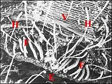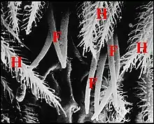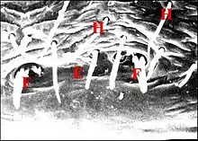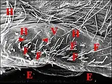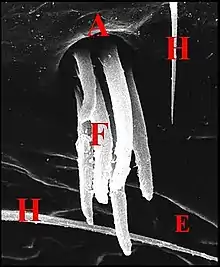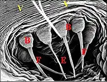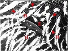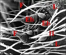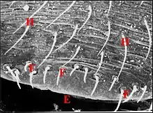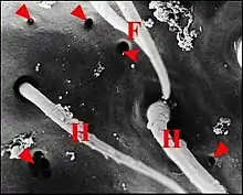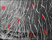 Dans les coupes histologiques (C.H.), à la loupe binoculaire et surtout au microscope électronique à balayage (M.E.B)[14], les fusules se présentent comme des structures de forme assez constante mais de disposition plus variable. Leur compte permet évidemment celui des corps acineux, donc des glandes prégonoporales, souvent difficile et parfois impossible dans les coupes histologiques (C.H.) lorsqu’elles y sont trop nombreuses. Soulignons qu'elles ne doivent pas être confondues avec les poils qui les entourent, surtout lorsqu'ils sont lisses (Fig. ), plutôt que barbelés (Fig. ).