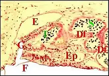 E,fente épigastrique - Ep, glandes épigastriques prégonoporales - G, gonopore - S, spermatozoïdes - T, canal commun terminal -
