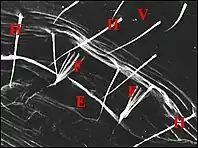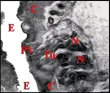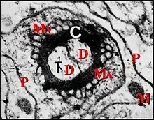 Le prolongement axonique n’a été qu’entrevu. Les dendrites des deux neurones de chaque unité renferment des s longitudinaux (Fig. ). D’après des documents photographiques aujourd’hui perdus, ils semblent comporter aussi des centrioles et un corps tubulaire n’existant peut être que dans un seul d’entre eux. Ces dendrites, accolés en couple, sont entourés par la gaine cuticulaire, très osmiophile, nette à leur contact, mal limitée extérieurement et allant rejoindre la papille pour s’y insérer (Fig. ).