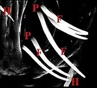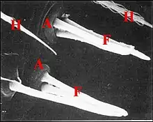 - Les organes gonoporaux ont été découverts et décrits chez les Clubionidae et les Dysderidae[8] puis dans d’autres familles[9],[10],[11]. Faute d’étude ultrastructurale qui aurait montré leur nature nerveuse, ils ont été considérés initialement à tort comme des glandes. Constants, les gonoporaux se rencontrent pratiquement chez les mâles de toutes les espèces d’araignées étudiées jusqu’en 1977[2].