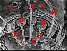 La disposition des fusules, que l'on peut qualifier de "fusulotaxie"(réemployant ainsi un "suffixe" parfois accolé au nom de certains poils sensoriels, les trichobothries = "trichobothriotaxie") est très variable suivant les groupes[14] et atteint son maximum d'originalité dans le cas des Tetragnathidae.