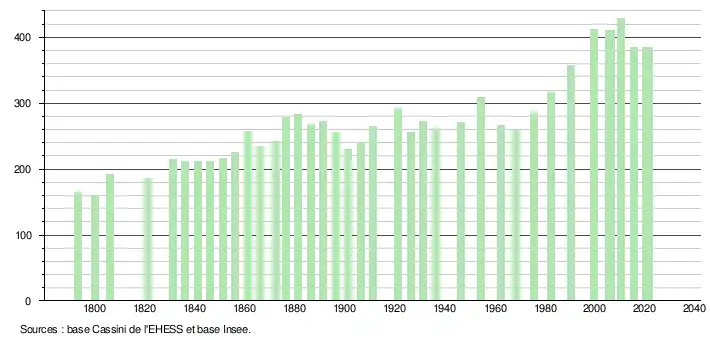 L'évolution du nombre d'habitants est connue à travers les recensements de la population effectués dans la commune depuis 1793. Pour les communes de moins de 10 000 habitants, une enquête de recensement portant sur toute la population est réalisée tous les cinq ans, les populations légales des années intermédiaires étant quant à elles estimées par interpolation ou extrapolation[19]. Pour la commune, le premier recensement exhaustif entrant dans le cadre du nouveau dispositif a été réalisé en 2005[20].