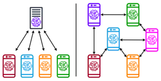 L'apprentissage fédéré (complètement) décentralisé (appelé fully decentralized federated learning ou gossip learning en anglais) correspond à un paradigme où il n'existe pas de serveur central : les agents communiquent directement les uns avec les autres et diffusent leurs modèles locaux en pair-à-pair[13],[14].
