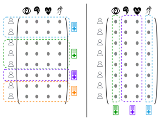 En apprentissage fédéré vertical[11], chaque agent connait une ou plusieurs colonnes complètes de la matrice de données d'apprentissage. En d'autres termes, chaque agent a des informations partielles sur l'ensemble des individus. Par exemple, différents hôpitaux peuvent avoir des données complémentaires sur le même ensemble de patients.