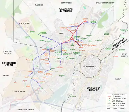 - la dernière branche se subdivise elle-même en deux branches au niveau de la limite entre Anzin et Valenciennes, sous l'actuel dépôt de Saint-Waast du tramway de Valenciennes :