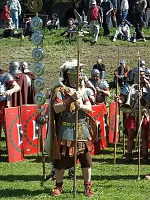 L'emblème « aquila » portait généralement des ailes levées entourées par une couronne de laurier. Il était monté sur une base trapézoïdale étroite, montée sur une hampe qui permettait de le porter bien haut.