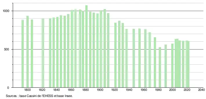 L'évolution du nombre d'habitants est connue à travers les recensements de la population effectués dans la commune depuis 1793. Pour les communes de moins de 10 000 habitants, une enquête de recensement portant sur toute la population est réalisée tous les cinq ans, les populations légales des années intermédiaires étant quant à elles estimées par interpolation ou extrapolation[25]. Pour la commune, le premier recensement exhaustif entrant dans le cadre du nouveau dispositif a été réalisé en 2004[26].