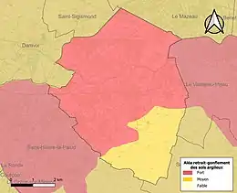 Les mouvements de terrains susceptibles de se produire sur la commune sont des mouvements de terrains, notamment des tassements différentiels[19]. Le retrait-gonflement des sols argileux est susceptible d'engendrer des dommages importants aux bâtiments en cas d’alternance de périodes de sécheresse et de pluie[20]. La totalité de la commune est en aléa moyen ou fort (54,9 % au niveau départemental et 48,5 % au niveau national)[Carte 2]. Depuis le , en application de la loi ELAN, différentes contraintes s'imposent aux vendeurs, maîtres d'ouvrages ou constructeurs de biens situés dans une zone classée en aléa moyen ou fort[Note 3],[21].