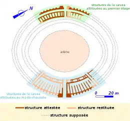 Il possède la particularité d'être partiellement construit en terrain plat au sud et à l'est, du côté du lycée Condé (structures à voûtes rampantes) et pour une autre partie édifié contre la pente de la colline de Charmont au nord-ouest, au niveau de la rue Marulaz (structure partiellement massive)[8],[7] comme à Trèves ou à Pula[9]. Cette particularité architecturale fait que la façade présente deux niveaux d'arcatures au sud et à l'est mais un seul, correspondant au « premier étage », au nord-ouest. Pour la même raison, le monument est dépourvu de galerie annulaire desservant le rez-de-chaussée ; elle n'existe qu'au premier niveau[7].