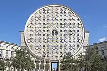 Les deux éléments caractéristiques de l'ensemble sont deux immeubles de forme cylindrique (surnommés les « camemberts » par les habitants), placés au-dessus des côtés ouest et est de la place.