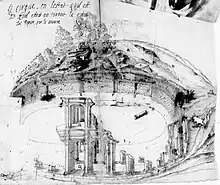 Vers 1628, Anne (de) Rulman et Pierre Barral, deux architectes, publient un ouvrage sur les monuments antiques de la Gaule narbonnaise. Plusieurs planches sont consacrées à l'amphithéâtre de Béziers. L'une d'elles reproduit des vestiges du monument, et les récents travaux permettent de confirmer l'exactitude de ces dessins[7]. La façade extérieure se présente sous forme d'une succession d'arcades, peut-être ouvertes, disposées sur deux étages, encadrées par des colonnes et des pilastres. Le monument peut ainsi atteindre une hauteur maximale de 17 m[6]. L'amphithéâtre étant partiellement construit en appui sur une colline, il semble que certaines parties de ses gradins et du parement de sa façade aient été taillées dans le roc, permettant ainsi de faire une économie de maçonnerie[8].