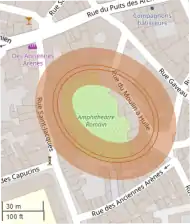 En l'absence de tout vestige en élévation les dimensions de l'amphithéâtre sont dans les premiers temps évaluées à partir de photographies aériennes, de plans cadastraux et de rares observations archéologiques. Elles sont très variables selon les auteurs. Pour Gérard Coulon (2006), elles sont de 86 × 70 m[4] ; Monique Clavel-Lévêque (1970) les évalue à 103,60 × 74 m mais cite d'autres auteurs qui évoquent 105 × 75 m[5].