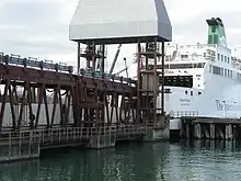 À l'accostage le navire cule dans un bassin qui épouse ses formes arrière, et vient positionner la poupe contre une tour supportant 2 rampes superposées appelées linkspans (en). La rampe inférieure est pourvue de rails et vient s'encastrer dans un berceau prévu à cet effet au niveau du rail deck, connectant le réseau ferroviaire terrestre aux tronçons du bord. La rampe supérieure vient se poser sur le vehicule deck. Ainsi les 2 niveaux se chargent ou se déchargent indépendamment. Une coupée télescopique vient se positionner sur un portelone au pont 7 du côté tribord pour les passagers piétons.