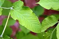 Les feuilles sont composées 2 ou 3 pennées. Le pétiole fait de 15 à 30 cm de long. Il y a 3-5 folioles par penne, qui sont ovales à oblongs-ovales, de taille assez grande 4–15 cm de long sur 3–9 cm de large, membraneuse à subcoriace, la base arrondie à cordée, la marge dentée en scie, l’apex aigu.