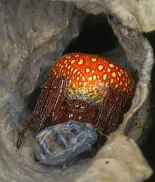 Les mâles mesurent de 6,5 à 8,5 mm et les femelles de 12 à 14,9 mm[2]. La couleur de l'abdomen de forme globulaire va du beige à l'orange. De nombreux points jaunâtres en parsèment la surface. Cette araignée est très colorée, elle se cache dans une feuille morte roulée en cornet.