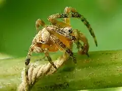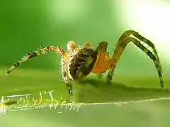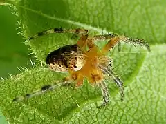 Son corps est brun et jaune, ses pattes ornées de bandes. Son abdomen peut être globuleux ou simplement conique. Son ventre, noir et maculé de deux taches blanches, est distinctif.