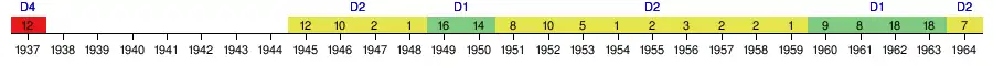 | 1945 | 2e | 12e | 14 | 17 | 5 | 4 | 8 | 24 | 31 | -7 | Huitièmes de finale |