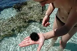 Comme tous les oursins vivant à proximité de la surface, l'oursin noir est souvent responsable de vives douleurs quand un baigneur marche dessus par inadvertance : ses épines ont tendance à se casser dans la plaie, ce qui les rend presque impossibles à enlever entièrement[7]. Heureusement, il n'est pas venimeux, et ne présente pas de grand danger si la plaie est correctement désinfectée : le corps dissoudra les débris en quelques semaines.