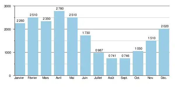 D'autre part, les crues peuvent être très importantes. Les QIX 2 et QIX 5 valent respectivement 47 et 65 m3/s. Le QIX 10 vaut 76 m3/s, tandis que le QIX 20 se monte à 88 m3/s, et le QIX 50 à 100 m3/s.