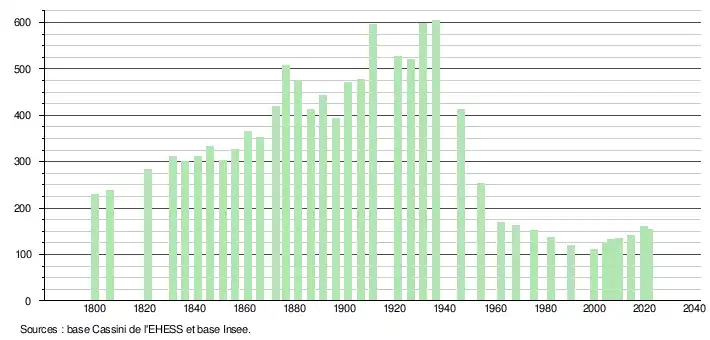 L'évolution du nombre d'habitants est connue à travers les recensements de la population effectués dans la commune depuis 1800. Pour les communes de moins de 10 000 habitants, une enquête de recensement portant sur toute la population est réalisée tous les cinq ans, les populations légales des années intermédiaires étant quant à elles estimées par interpolation ou extrapolation[7]. Pour la commune, le premier recensement exhaustif entrant dans le cadre du nouveau dispositif a été réalisé en 2004[8].