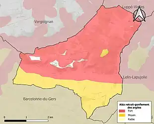 Le retrait-gonflement des sols argileux est susceptible d'engendrer des dommages importants aux bâtiments en cas d’alternance de périodes de sécheresse et de pluie. 98,2 % de la superficie communale est en aléa moyen ou fort (94,5 % au niveau départemental et 48,5 % au niveau national). Sur les 75 bâtiments dénombrés sur la commune en 2019, 74 sont en aléa moyen ou fort, soit 99 %, à comparer aux 93 % au niveau départemental et 54 % au niveau national. Une cartographie de l'exposition du territoire national au retrait gonflement des sols argileux est disponible sur le site du BRGM[21],[Carte 3].