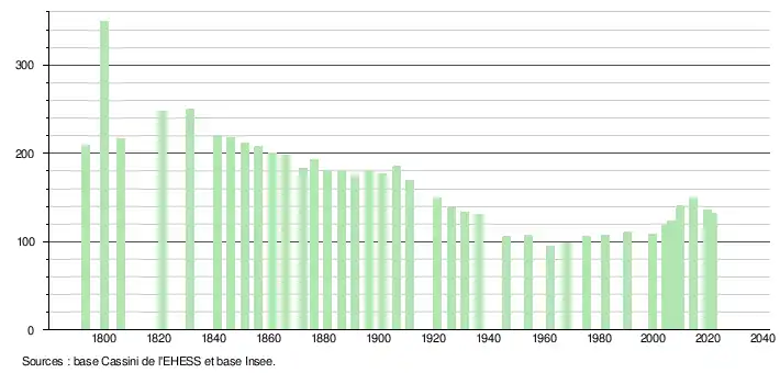 L'évolution du nombre d'habitants est connue à travers les recensements de la population effectués dans la commune depuis 1793. Pour les communes de moins de 10 000 habitants, une enquête de recensement portant sur toute la population est réalisée tous les cinq ans, les populations légales des années intermédiaires étant quant à elles estimées par interpolation ou extrapolation[25]. Pour la commune, le premier recensement exhaustif entrant dans le cadre du nouveau dispositif a été réalisé en 2004[26].
