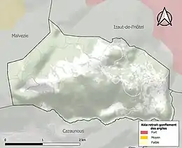 Le retrait-gonflement des sols argileux est susceptible d'engendrer des dommages importants aux bâtiments en cas d’alternance de périodes de sécheresse et de pluie. 0 % de la superficie communale est en aléa moyen ou fort (88,8 % au niveau départemental et 48,5 % au niveau national). Sur les 99 bâtiments dénombrés sur la commune en 2019, 0 sont en aléa moyen ou fort, soit 0 %, à comparer aux 98 % au niveau départemental et 54 % au niveau national. Une cartographie de l'exposition du territoire national au retrait gonflement des sols argileux est disponible sur le site du BRGM[33],[Carte 3].