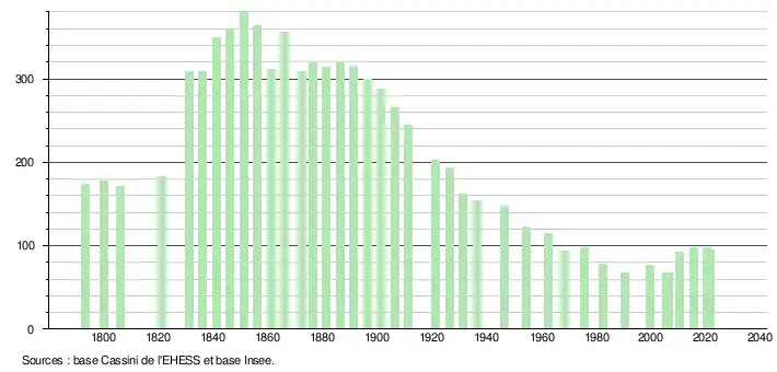 | L'évolution du nombre d'habitants est connue à travers les recensements de la population effectués dans la commune depuis 1793. Pour les communes de moins de 10 000 habitants, une enquête de recensement portant sur toute la population est réalisée tous les cinq ans, les populations légales des années intermédiaires étant quant à elles estimées par interpolation ou extrapolation[37]. Pour la commune, le premier recensement exhaustif entrant dans le cadre du nouveau dispositif a été réalisé en 2005[38]. En 2021, la commune comptait 95 habitants[Note 7], en diminution de 3,06 % par rapport à 2015 (Haute-Garonne : +7,43 %, France hors Mayotte : +1,84 %). |