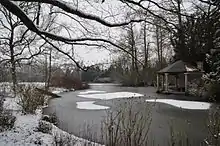 En franchissant la grille d’entrée, le visiteur est au milieu d’une vaste pelouse bordée à gauche par un étang agrémenté en son centre par l’ "Ile Amélie" peuplée de cyprès chauves et de Pterocarya du Caucase donnant des teintes automnales rouille et or. Cette pièce d’eau se rétrécit et se termine par une fabrique, le "lavoir à colonnes".