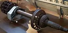 - arbre de transmission secondaire[9] : arbre qui relie la sortie de la boîte de vitesses aux roues motrices (généralement par l'intermédiaire de dispositifs de renvois). Un tel arbre est presque toujours équipé de joints de cardan.