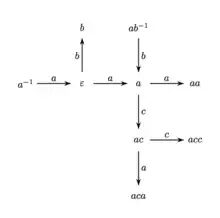 Soit et soit . Les préfixes réduits de sont (calculés de la gauche vers la droite) : . L'arbre de Munn de est donné ci-dessous. On ne trace que des arcs dont l'étiquette est dans , en supposant implicitement un arc en sens inverse étiqueté par la lettre correspondante de .