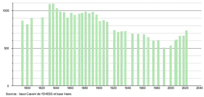 L'évolution du nombre d'habitants est connue à travers les recensements de la population effectués dans la commune depuis 1793. Pour les communes de moins de 10 000 habitants, une enquête de recensement portant sur toute la population est réalisée tous les cinq ans, les populations légales des années intermédiaires étant quant à elles estimées par interpolation ou extrapolation[16]. Pour la commune, le premier recensement exhaustif entrant dans le cadre du nouveau dispositif a été réalisé en 2007[17].