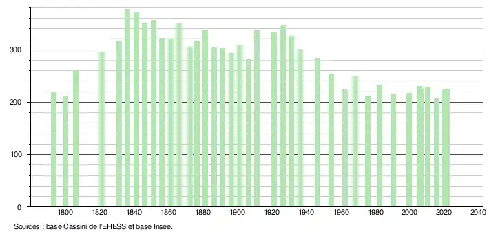 L'évolution du nombre d'habitants est connue à travers les recensements de la population effectués dans la commune depuis 1793. Pour les communes de moins de 10 000 habitants, une enquête de recensement portant sur toute la population est réalisée tous les cinq ans, les populations légales des années intermédiaires étant quant à elles estimées par interpolation ou extrapolation[15]. Pour la commune, le premier recensement exhaustif entrant dans le cadre du nouveau dispositif a été réalisé en 2005[16].