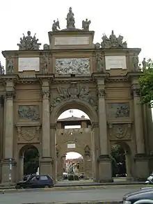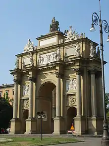 L'arc fut conçu par l'architecte français Jean Nicolas Jadot, alors nouvellement arrivé dans la ville[1] Certaines sources ajoutent une contribuation de Francesco Schamant de Lorraine[2].