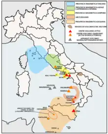L'appellation « arc volcanique campanien » est une facilité de langage étant admis que la zone n'est qu'une partie d'une région de volcanisme et de sismologie intenses plus large, en direction du sud, incluant les îles volcaniques d'Ustica, Stromboli, Vulcano jusqu'à l'Etna au nord-est de la Sicile.