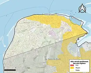 Le retrait-gonflement des sols argileux est susceptible d'engendrer des dommages importants aux bâtiments en cas d’alternance de périodes de sécheresse et de pluie. 26,5 % de la superficie communale est en aléa moyen ou fort (67,4 % au niveau départemental et 48,5 % au niveau national). Sur les 5 455 bâtiments dénombrés sur la commune en 2019, 2 262 sont en aléa moyen ou fort, soit 41 %, à comparer aux 84 % au niveau départemental et 54 % au niveau national. Une cartographie de l'exposition du territoire national au retrait gonflement des sols argileux est disponible sur le site du BRGM[44],[Carte 2].
