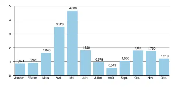 Le débit instantané maximal enregistré a été de 54 m3/s le , tandis que la valeur journalière maximale était de 29,4 m3/s le . En comparant la première de ces valeurs avec l'échelle des QIX de la rivière, cette crue était bien plus que cinquantennale, peut-être centennale ou plus, et certainement très exceptionnelle.