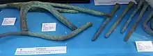 Chevilles (en métal, servant à fixer les plus grosses pièces de la charpente) et carvelles ( = clous de section carrée qui servaient à fixer des planches sur la charpente du navire) provenant du naufrage de la corvette Arab survenu le dans l'archipel des Glénan (Musée maritime du Cap-Sizun, DRASSM, inventeur Bernard de Maisonneuve).