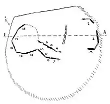 Plan du dolmen avec cairn de l'île Brunec, dessiné lors des fouilles par Marthe et Saint-Just Péquart[6].