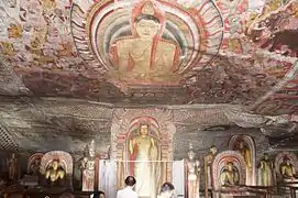 Les premiers aménagements des temples dans les cavernes ont été réalisés dans le complexe du temple de Mihintale[1]. Les temples de Polonnaruwa et de Temple d'Or de Dambulla étaient à leur origine rupestres, ce n'est que par la suite qu'ils furent transformés et aménagés. Des portes, des fenêtres furent installées, et des murs faits de briques ou en pierre furent ajoutés. Les toits et les murs furent enduits d'un crépi blanc, et ornés avec des fresques qui illustraient les contes de Jātaka . La caractéristique de ces grottes est l'utilisation du rebord sculpté sur le bord supérieur du plafond dans la roche pour arrêter les eaux de pluie, qui s'infiltrent dans la grotte.