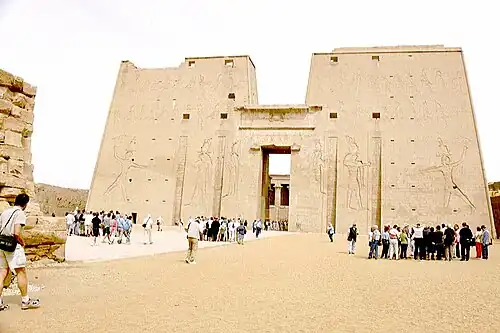 - un pylône, déjà utilisé dans les complexes funéraires de l'Ancien Empire[13], dont la façade est ornée d'oriflammes et précédée ou non par :